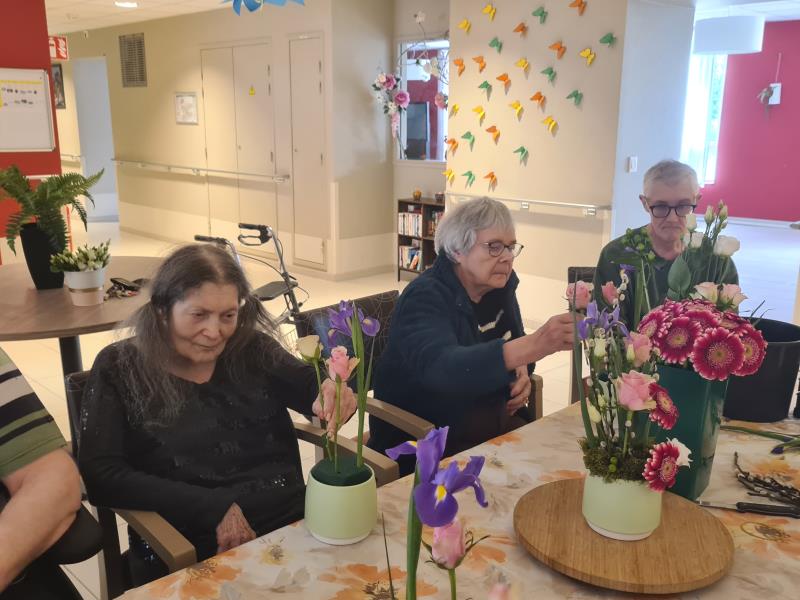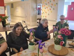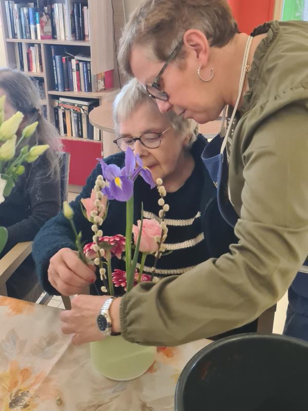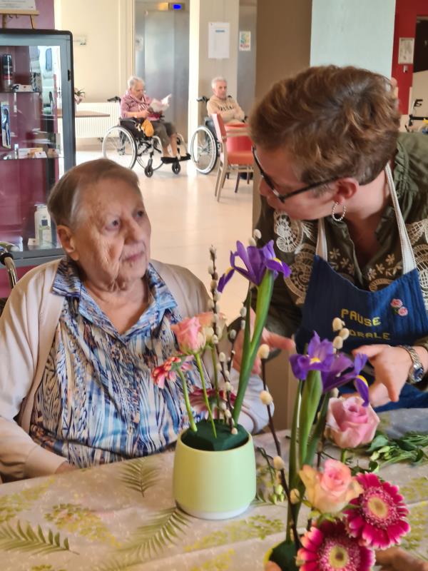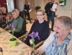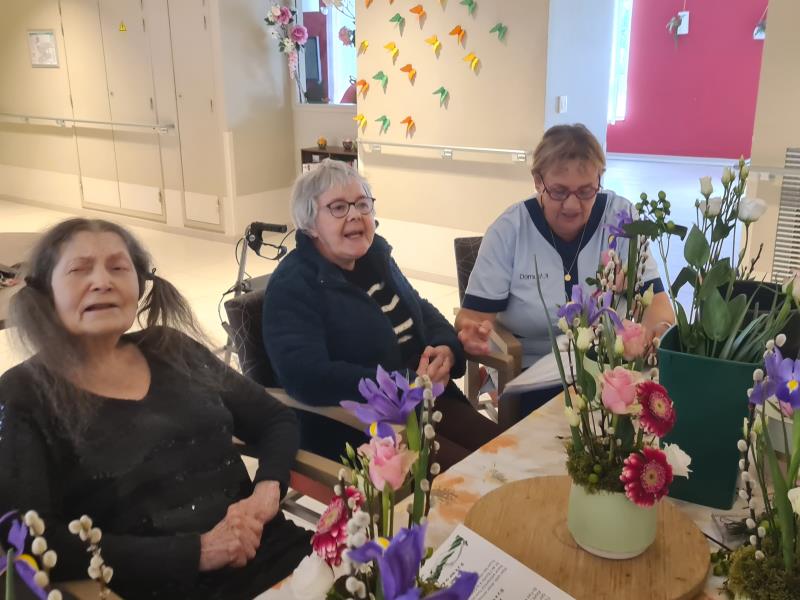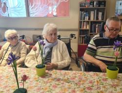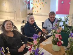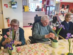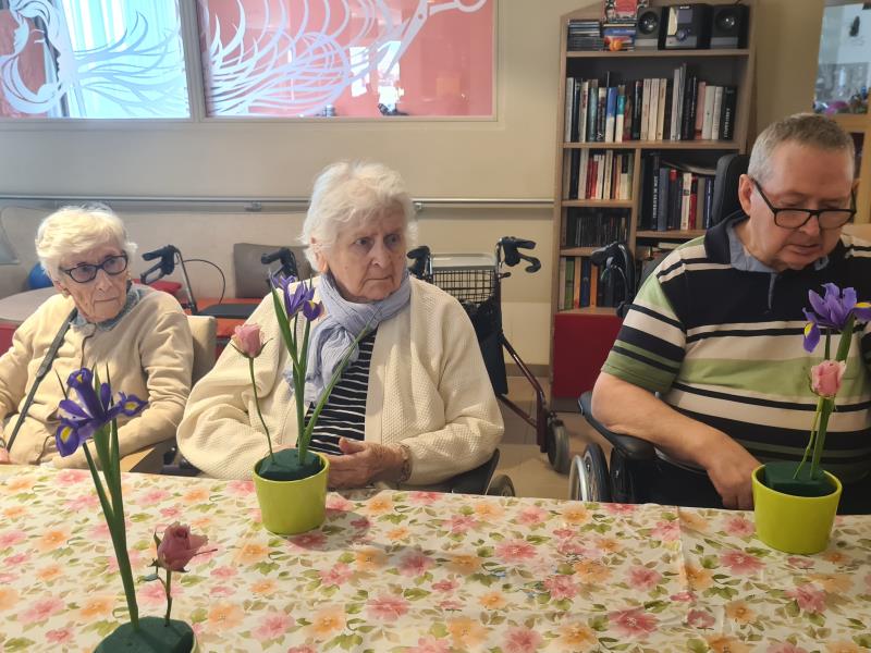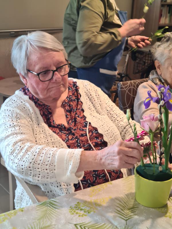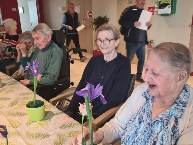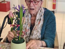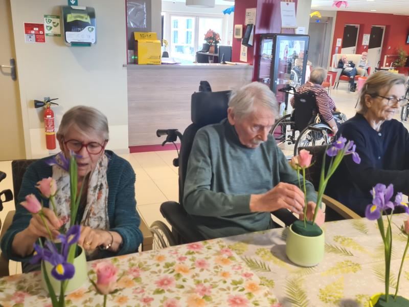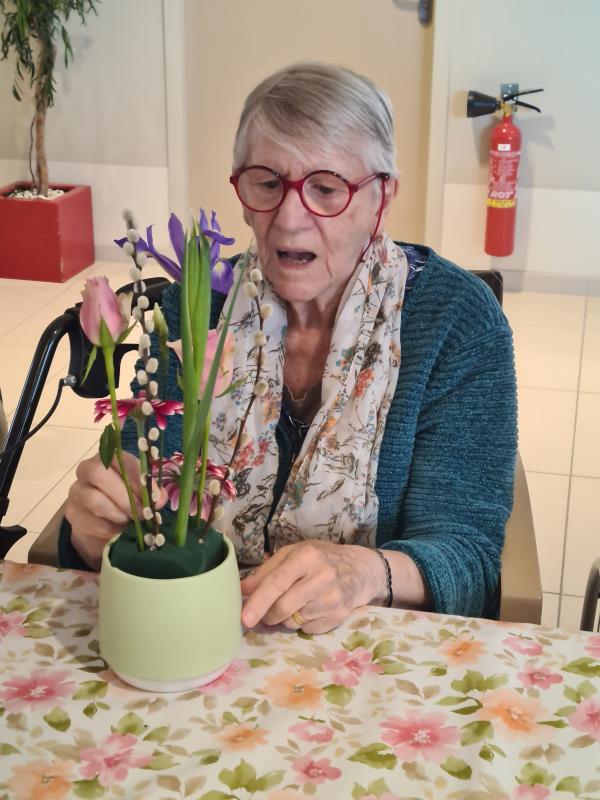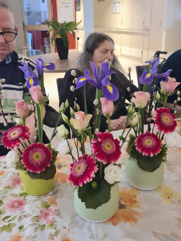 Un atelier d'art Floral proposé par Christèle, animatrice d'art floral, a été organisé pour les résidents, autour d'un travail délicat de "Chatons" associé à des fleurs de printemps, notamment des Iris. Ce moment créatif a permis à chacun de s'exprimer à travers des compositions naturelles, tout en stimulant la motricité fine, les sens ainsi que les repères dans l'espace grâce aux textures, aux volumes et aux couleurs saisonnières.
